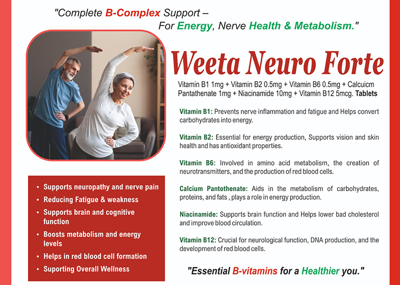 | WEETA NEURO FORTE Tab | VITAMIN B1 1MG + VITAMIN B2 0.5MG + VITAMIN B6 0.5MG + CALCIUM PANTATHENATE 1MG + NIACINAMIDE 10MG + VITAMIN B12 5MCG | 10*5*10 (Blister pack) | View Catalog | View Product |