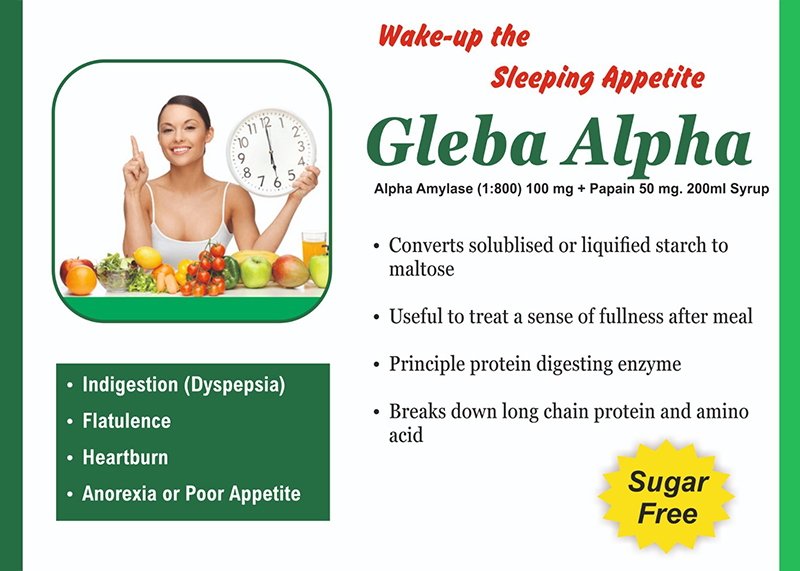 | GLEBA ALPHA (Sugarfree) | ALPHA AMYLASE 100 MG +PAPAIN 50 MG (SUGAR FREE) | 200 ML (Mono pack) | View Catalog | View Product |