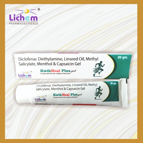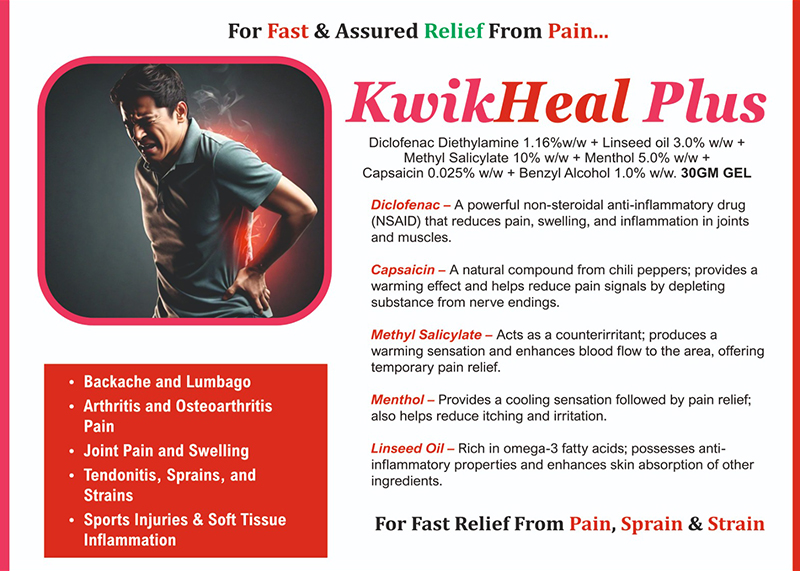 | KWIKHEAL GEL | Diclofenac Diethylamine 1.16% + Linseed oil 3% + Methyl Salicylate 10% + Menthol 5% + Benzyl Alcohol 1% | 30 gm (Mono Pack) | View Catalog | View Product |