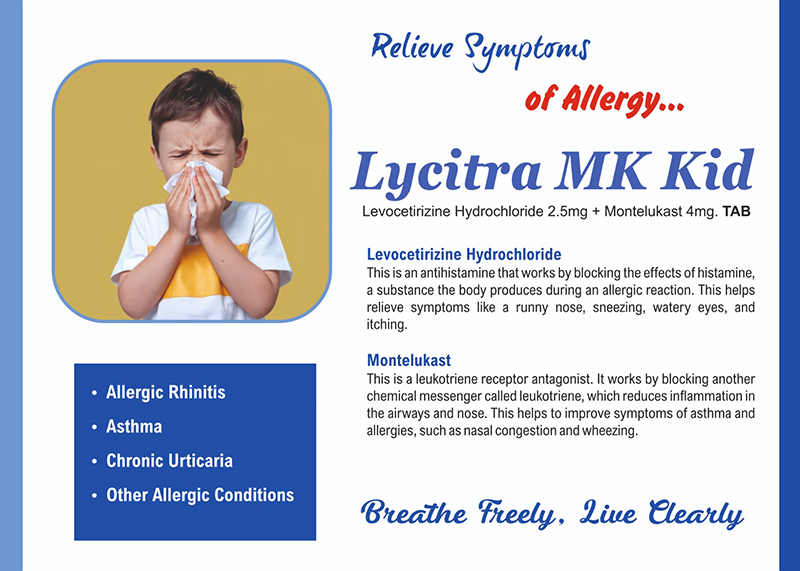 | LYCITRA MK KID Tab | LEVOCETIRIZINE 2.5 MG + MONTELUKAST 4 MG | 10*10 (Alu Alu pack) | View Catalog | View Product |