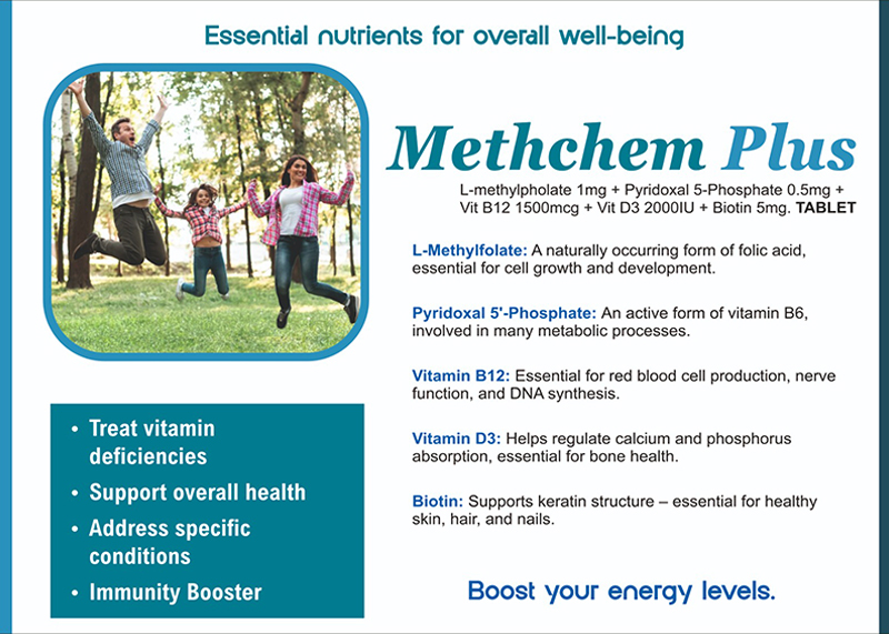 | METHCHEM PLUS Tab | L-METHYLFOLATE 1MG+PYRIDOXAL 5 PHOSPHATE 0.5MG+VIT B12 1500MCG+VIT D3 2000IU+BIOTIN 5MG | 10*10 (Alu Alu pack) | View Catalog | View Product |