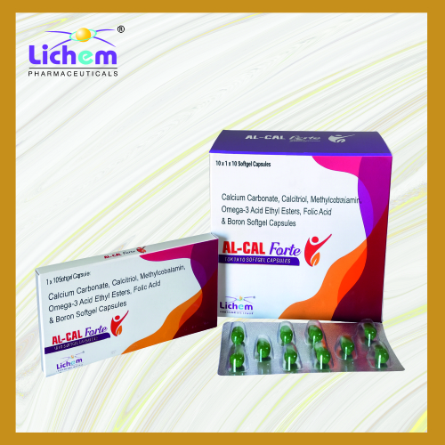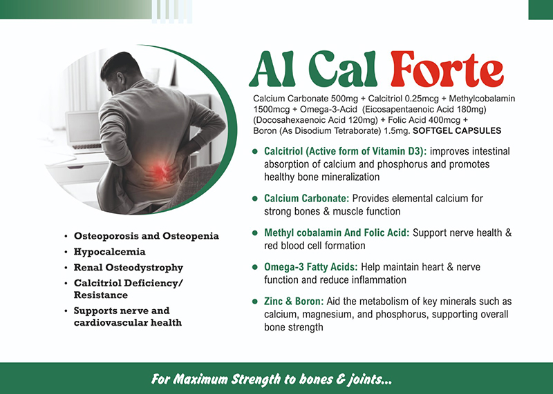 | AL CAL FORTE SOFTGEL | CALCITRIOL 0.25 MCG + CALCIUM CARBONATE 500 MG + OMEGA-3 ACIDS (EPA 180 MG + DHA 120 MG) + METHYLCOBALAMIN 1500 MCG + FOLIC ACID 400 MCG + BORON 1.5 MG | 10*1*10 (Blister pack) | View Catalog | View Product |